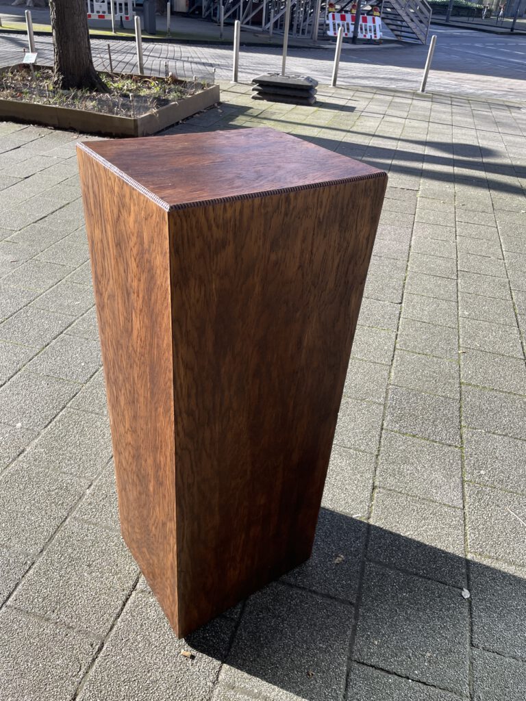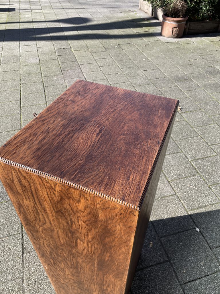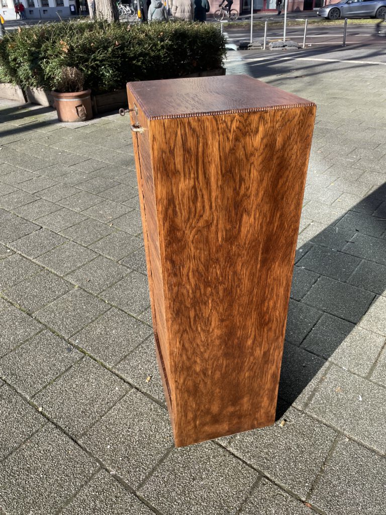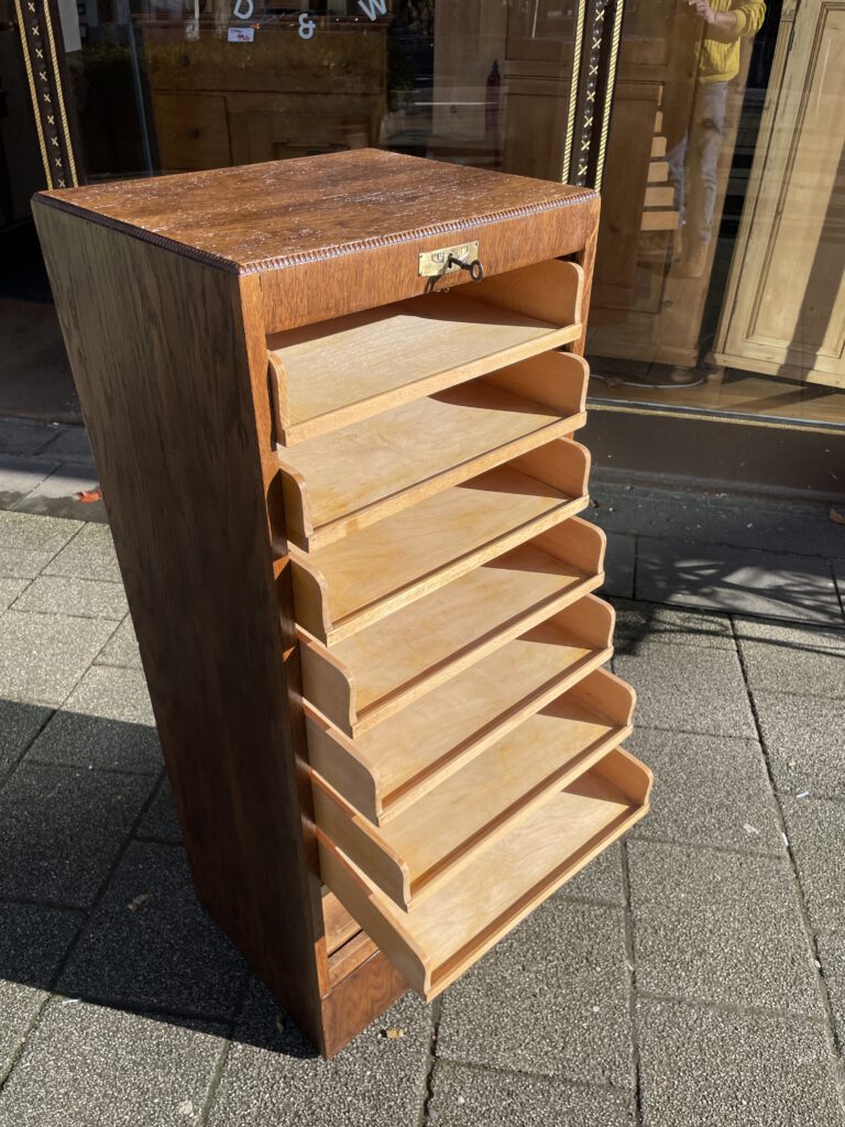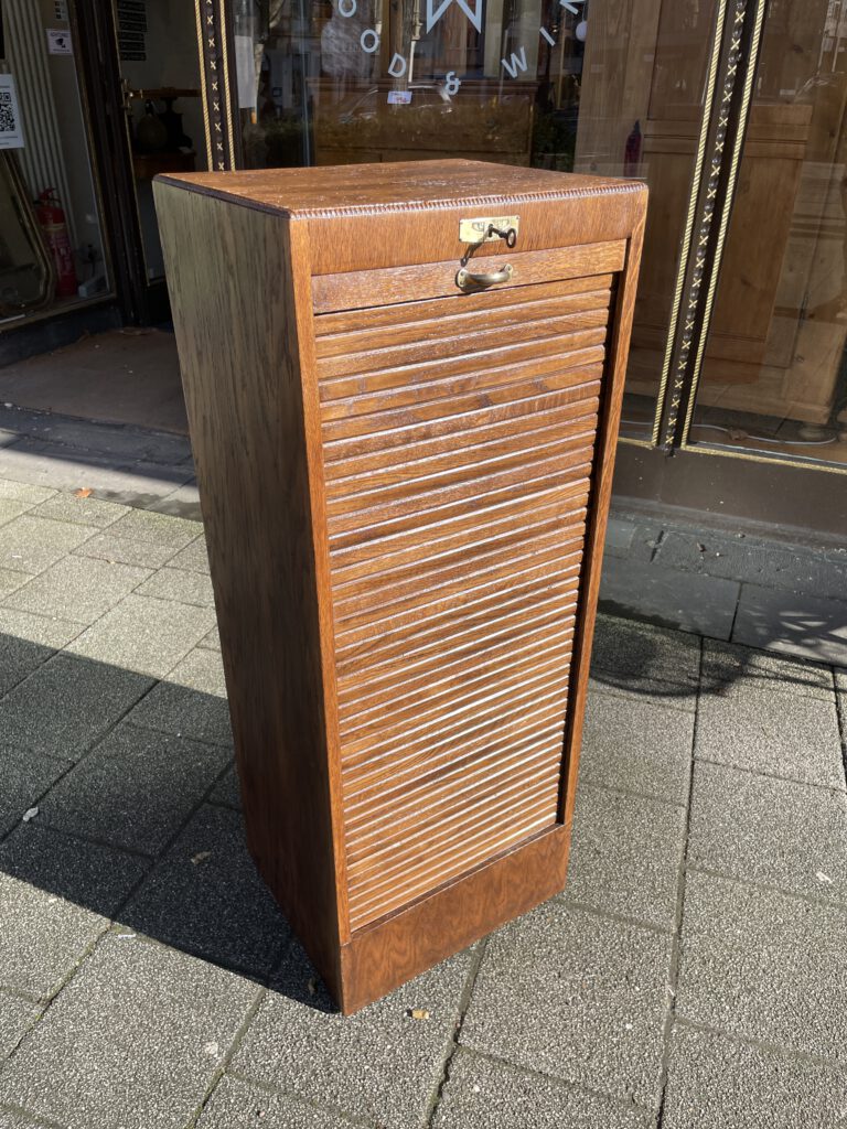 Büromöbel aus den 1920er Jahren, aus Eiche, vollständig original, restauriert und voll funktionsfähig. Das Besondere daran ist, dass sich im unteren Bereich zwei Holzrollen befinden, mit denen sich das Möbelstück ganz einfach verschieben lässt.